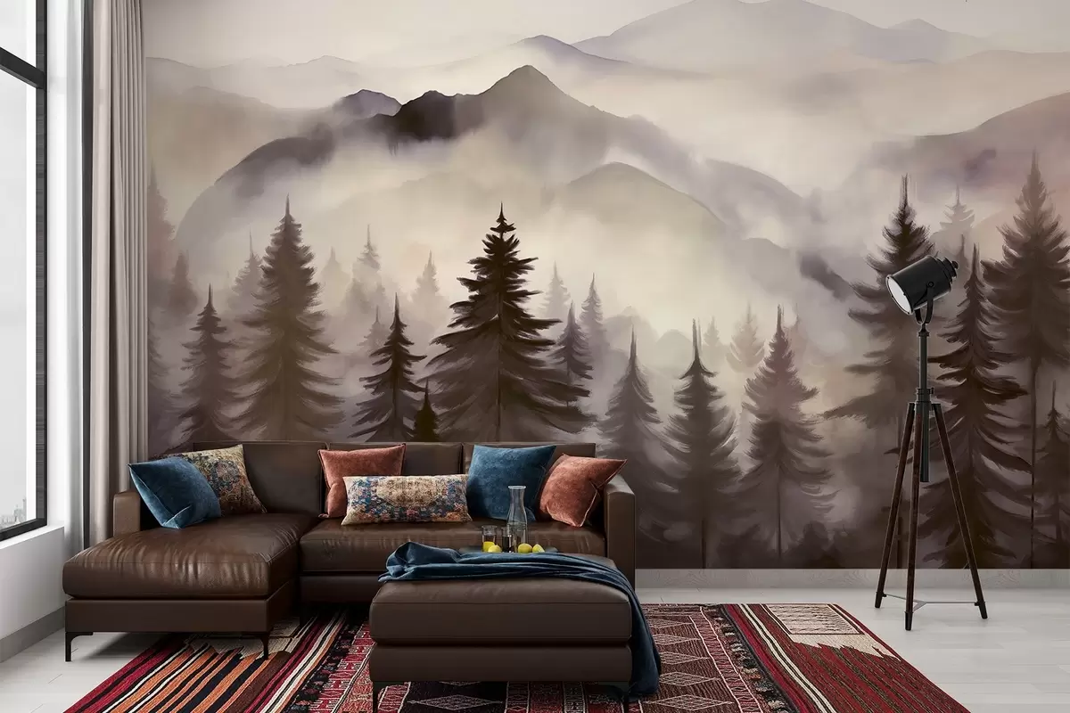 Fotobehang Berglandschap met een bos van pijnbomen en gelaagde bergen tijdens zonsopgang met lichte mist aquarel imitatie kunst N° w08639v1