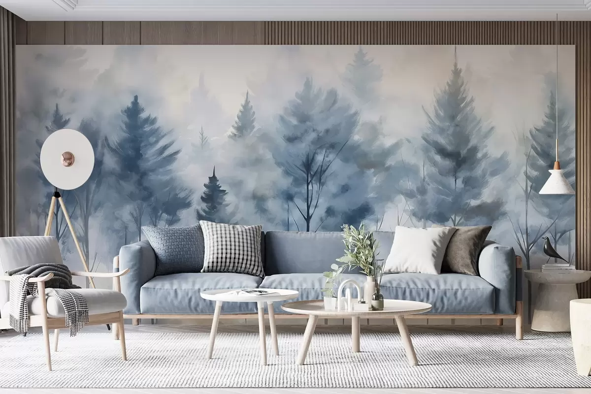 Fotobehang Een mistig boslandschap met hoge dennenbomen en kale loofbomen op de voorgrond aquarel imitatie kunst N° w08643