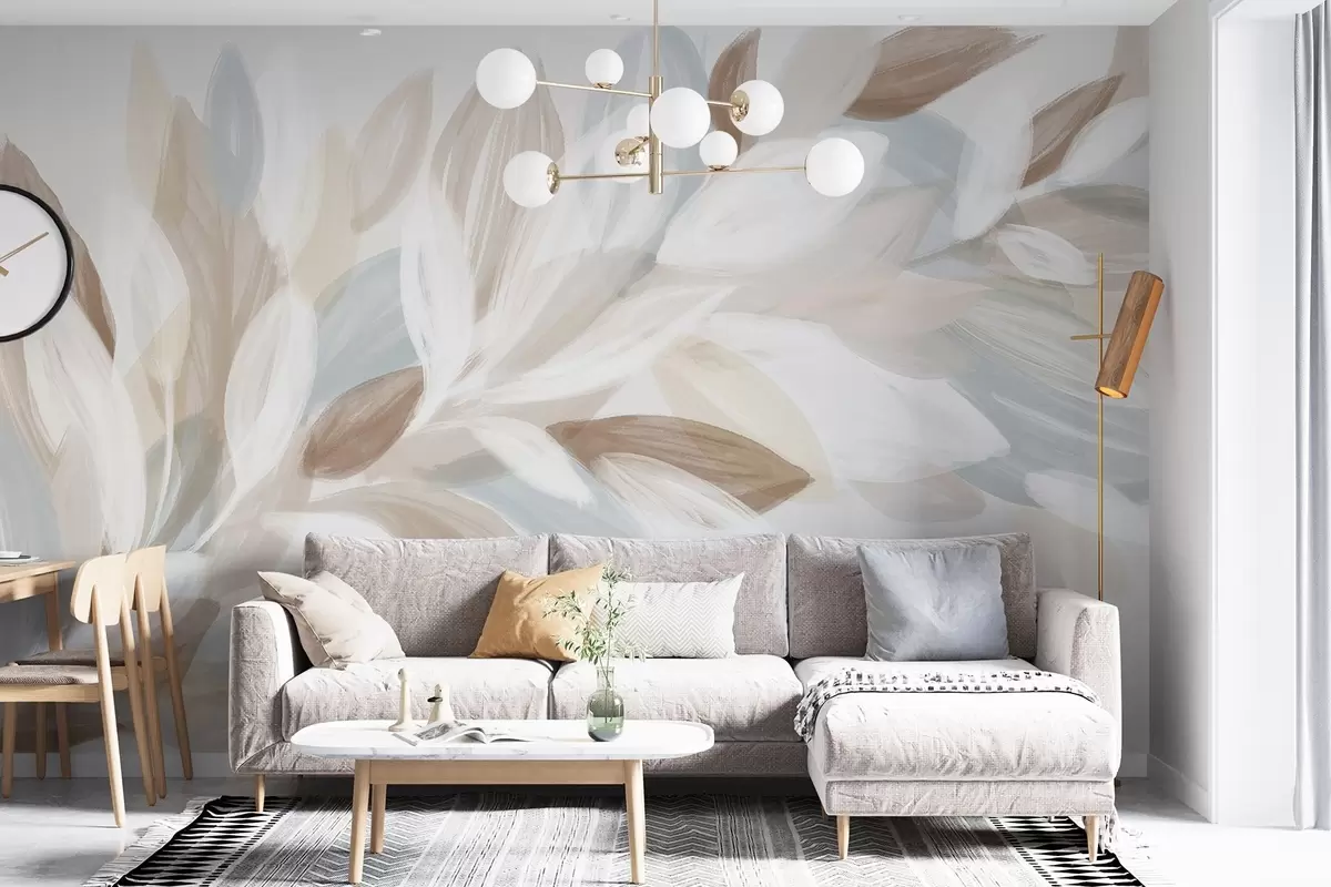 Fotobehang Zachte, pastelkleurige bladeren in tinten wit, beige en lichtblauw, die een delicate en etherische compositie creëren N° w08649