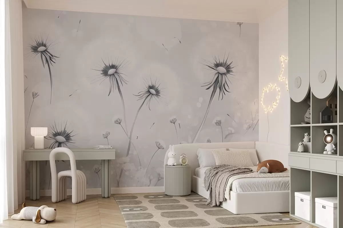 Fotobehang Elegante paardenbloemen en wilde bloemen in schilderstijl in blauwe tinten N° w08657v2