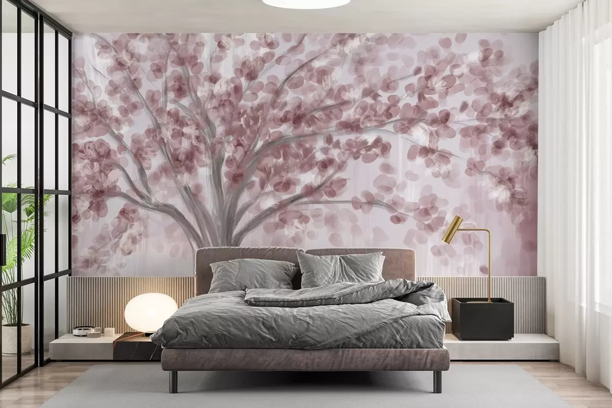 Fotobehang Een grote boom met zachte, abstracte bladeren in roze op een lichte, neutrale achtergrond die de tinten van de boom versterkt N° w08669v2