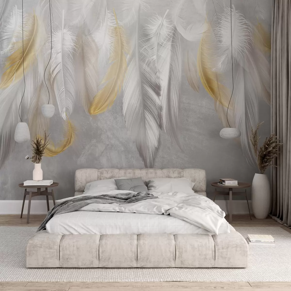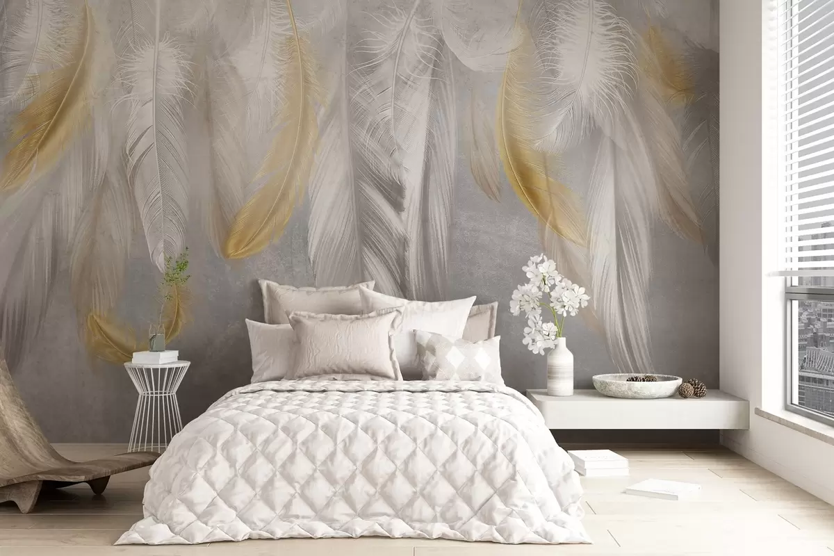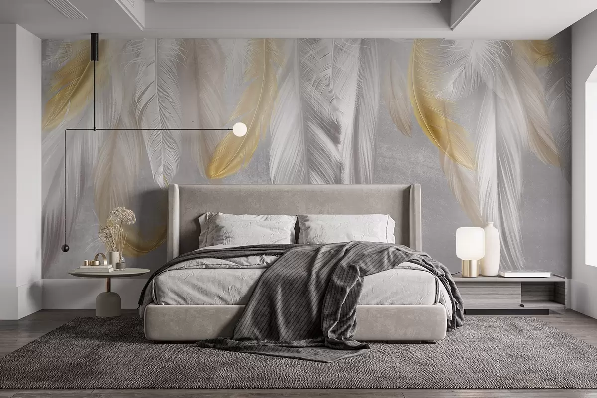 Fotobehang Witte en gele veren tegen een zachtgrijze achtergrond, waardoor een delicate en luchtige compositie ontstaat N° w08670