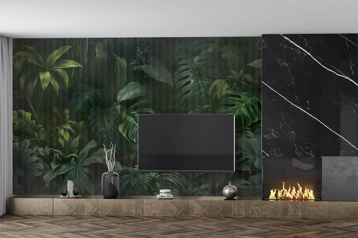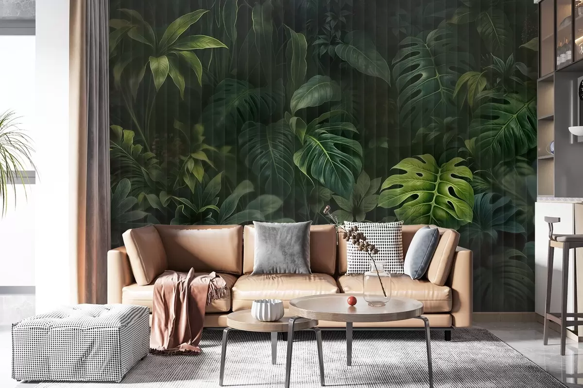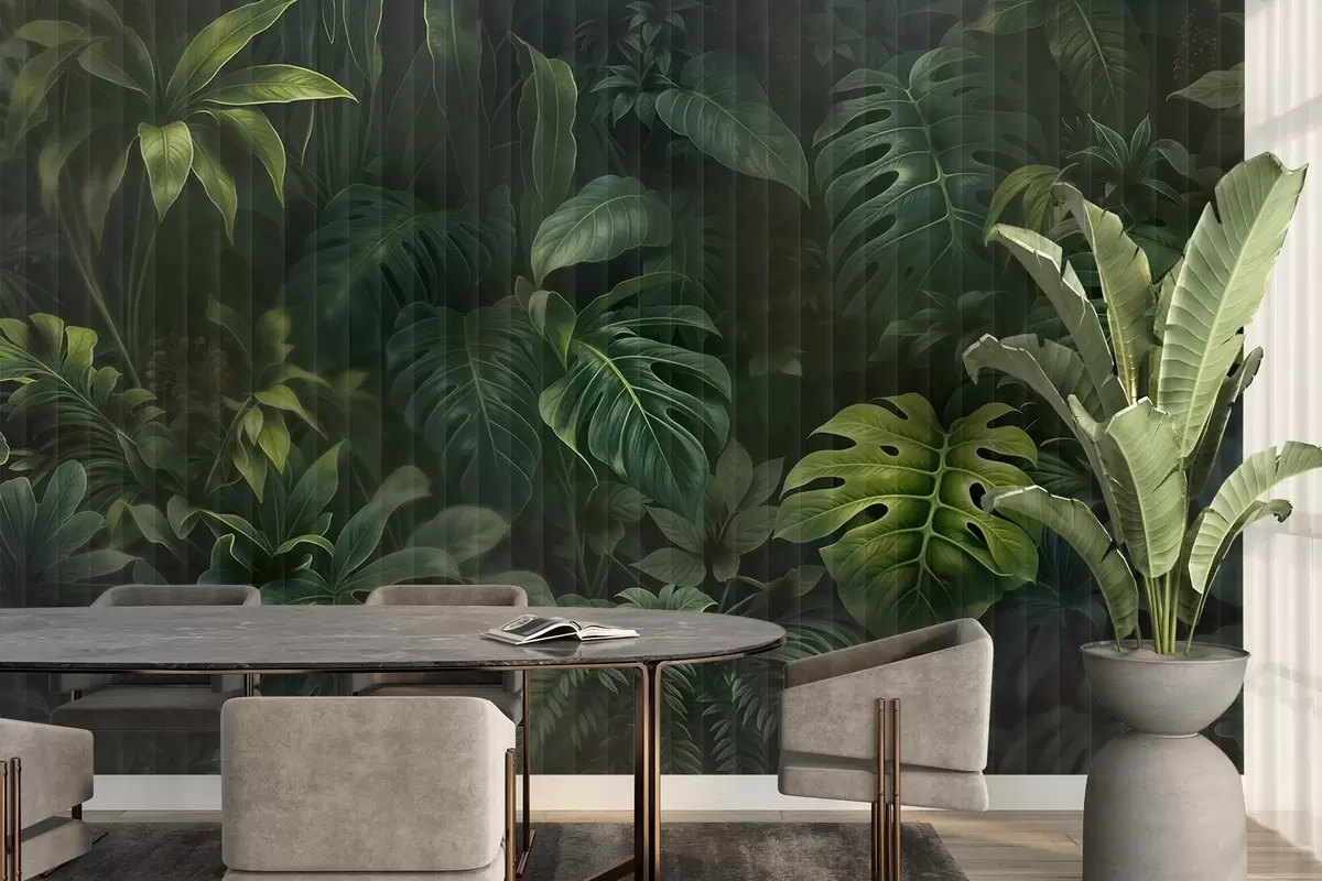 Fotobehang Tropische donkere vervaagde en gestructureerde print met verschillende groene bladeren, waaronder monstera en palmbladeren N° w08673