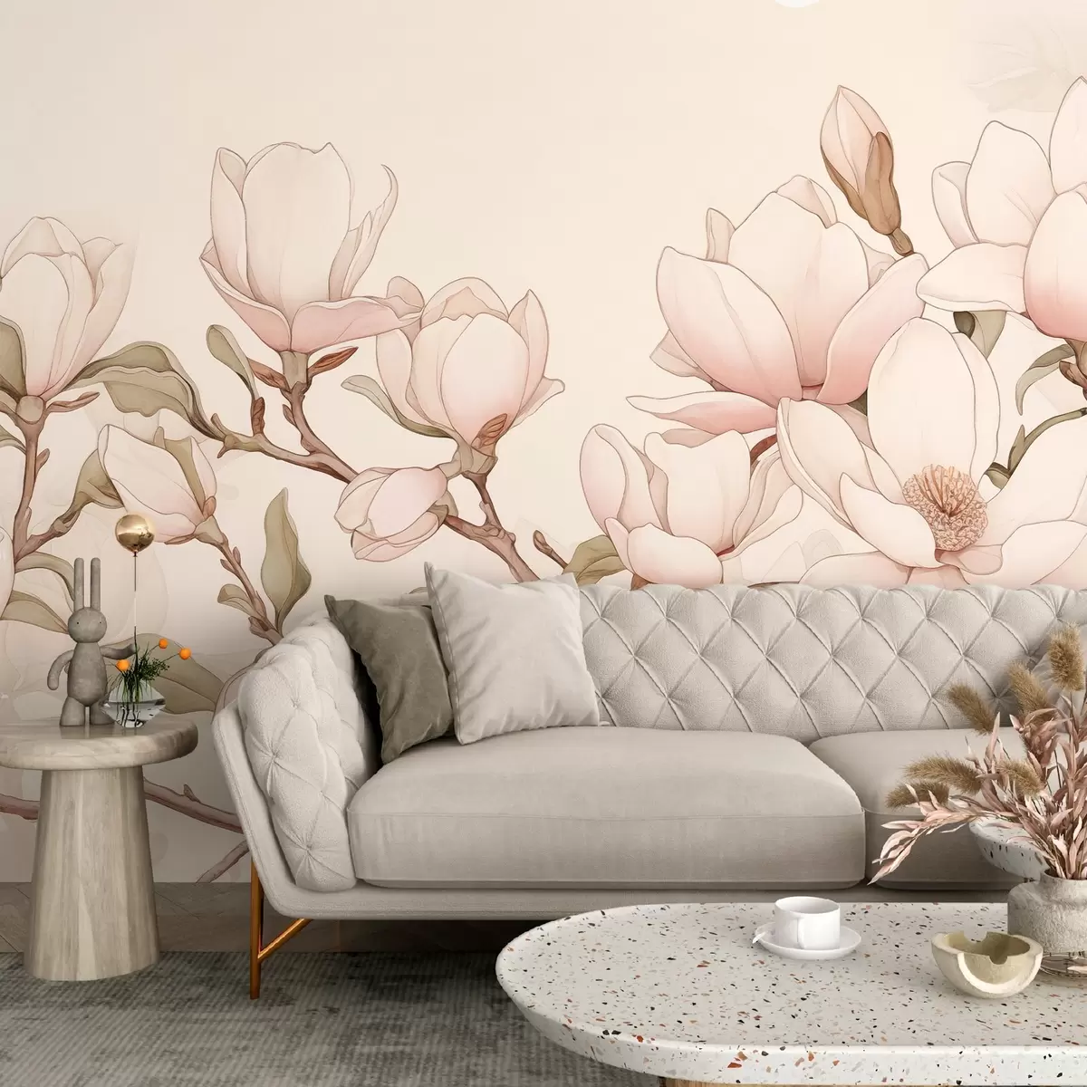 Fotobehang Magnolia takken met delicate roze bloemen op een lichte achtergrond, creëren een verfijnde en rustige sfeer N° w08688