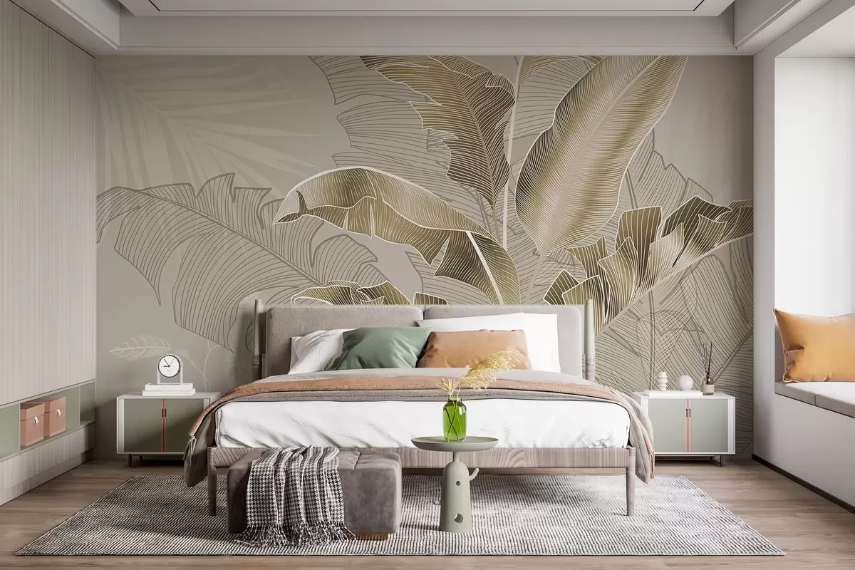 Fotobehang Een harmonieuze compositie van tropische bladeren in beige en bruine tinten, met gedetailleerd lijnwerk N° w08698