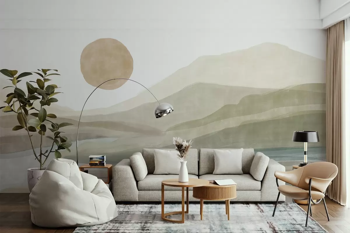 Fotobehang Een landschap van gelaagde bergen met een zachte helling, een kronkelende rivier, gedempt oranje zon in de lucht N° w08702