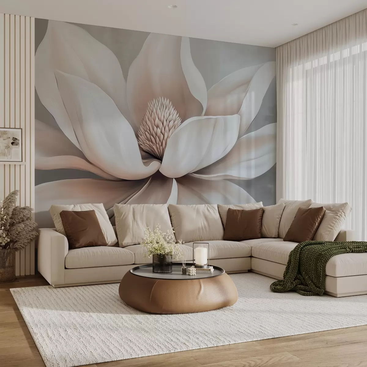 Fotobehang Elegante magnolia bloem met lange, gladde bloemblaadjes op een zachtgrijze achtergrond N° w08705