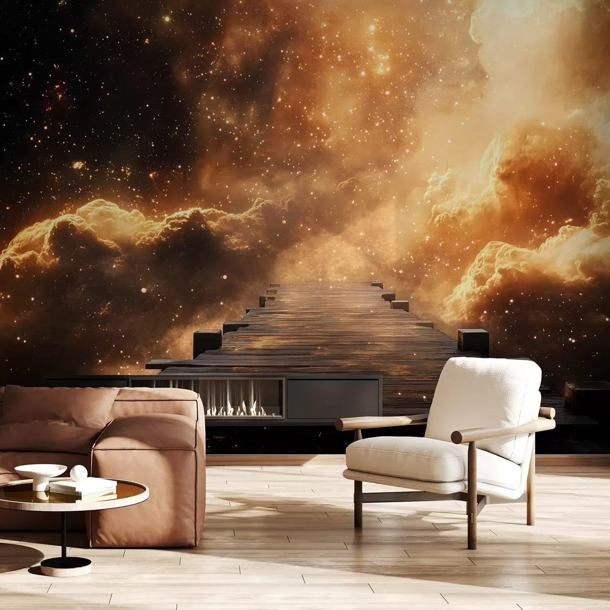 Fotobehang Kosmisch geel-zwarte sterrenhemel met een houten pier N° w08723