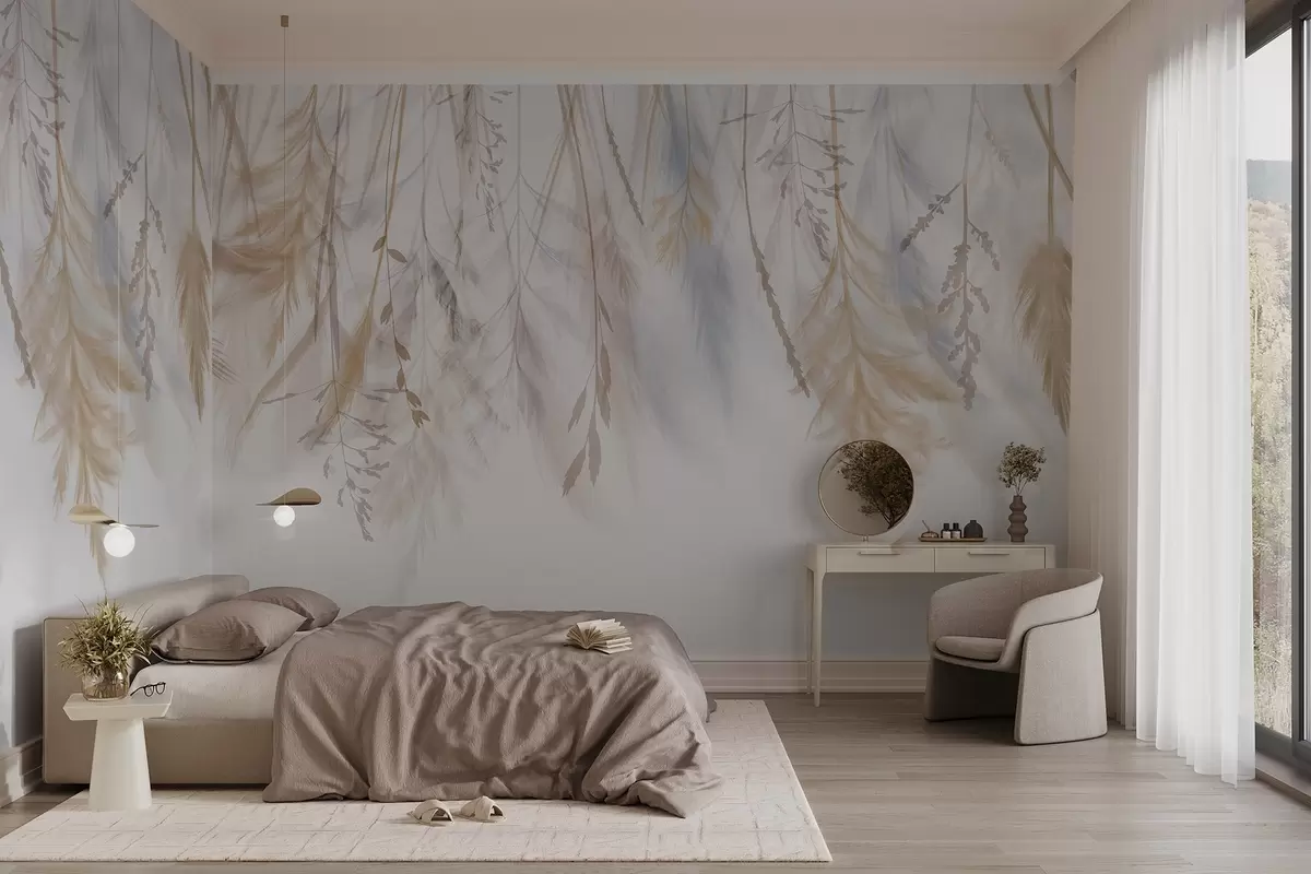 Fotobehang Delicate grassen, aartjes en planten in pasteltinten, gerangschikt in een cascadeprint tegen een bleke achtergrond N° w08737