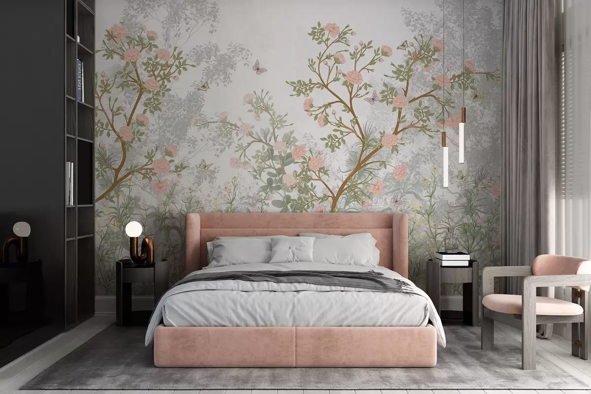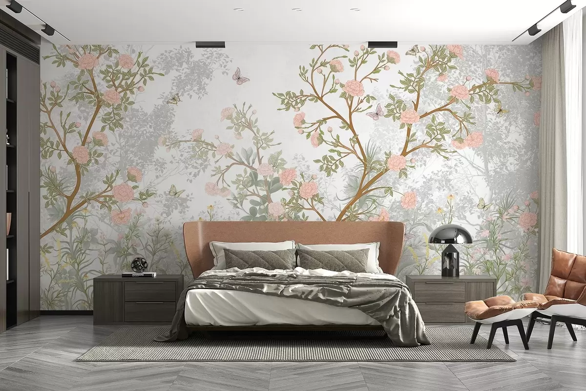 Fotobehang Delicaat roze bloeiende bomen, vliegende vlinders en groene bladeren verstrengeld met slanke takken N° w08744