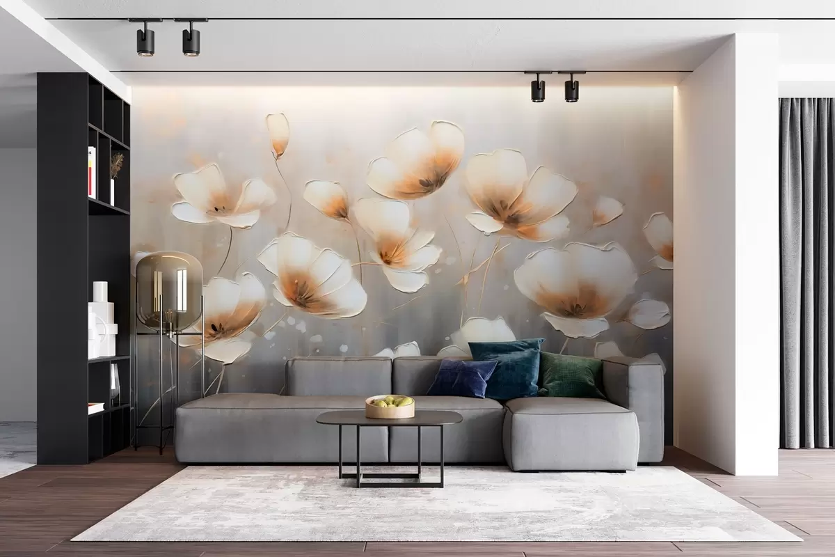 Fotobehang Elegante bloemen met delicate, zachte bloemblaadjes in beige-blauwe tinten N° w08746v1