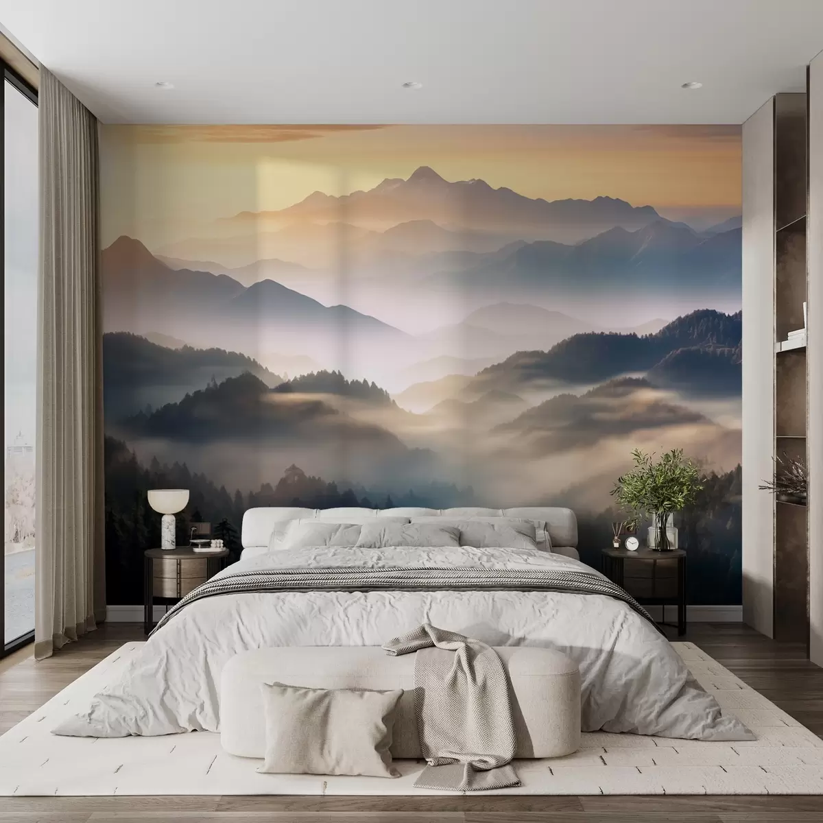Fotobehang Sereen berglandschap bij zonsopgang, met zachte mist die de dennenbomen omhult N° w08748