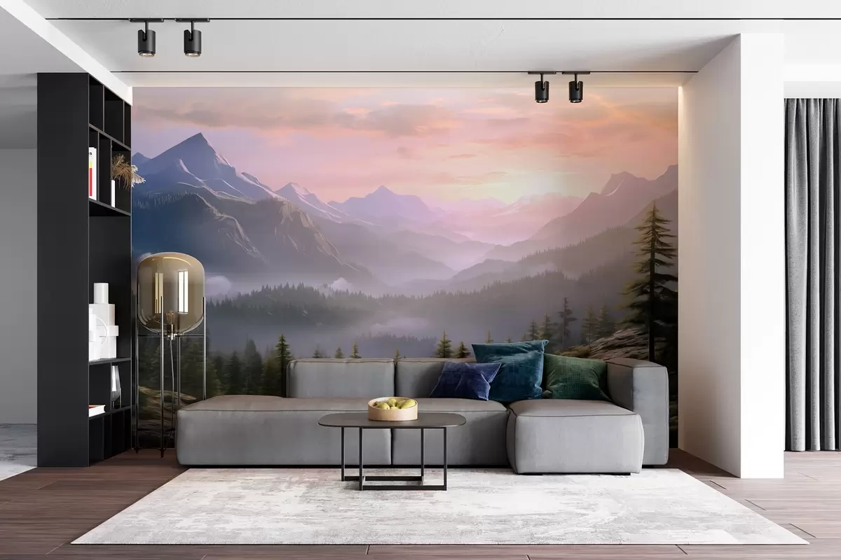 Fotobehang Sereen berglandschap bij dageraad met zachte mist tegen een bosachtige achtergrond N° w08750