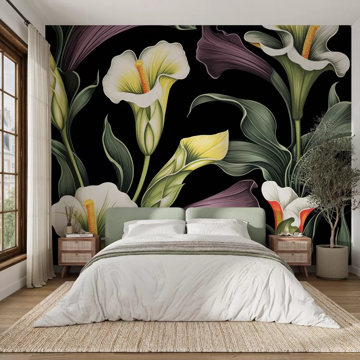 Fotobehang Wit-groene en paarse aronskelken op zwarte achtergrond N° w08752