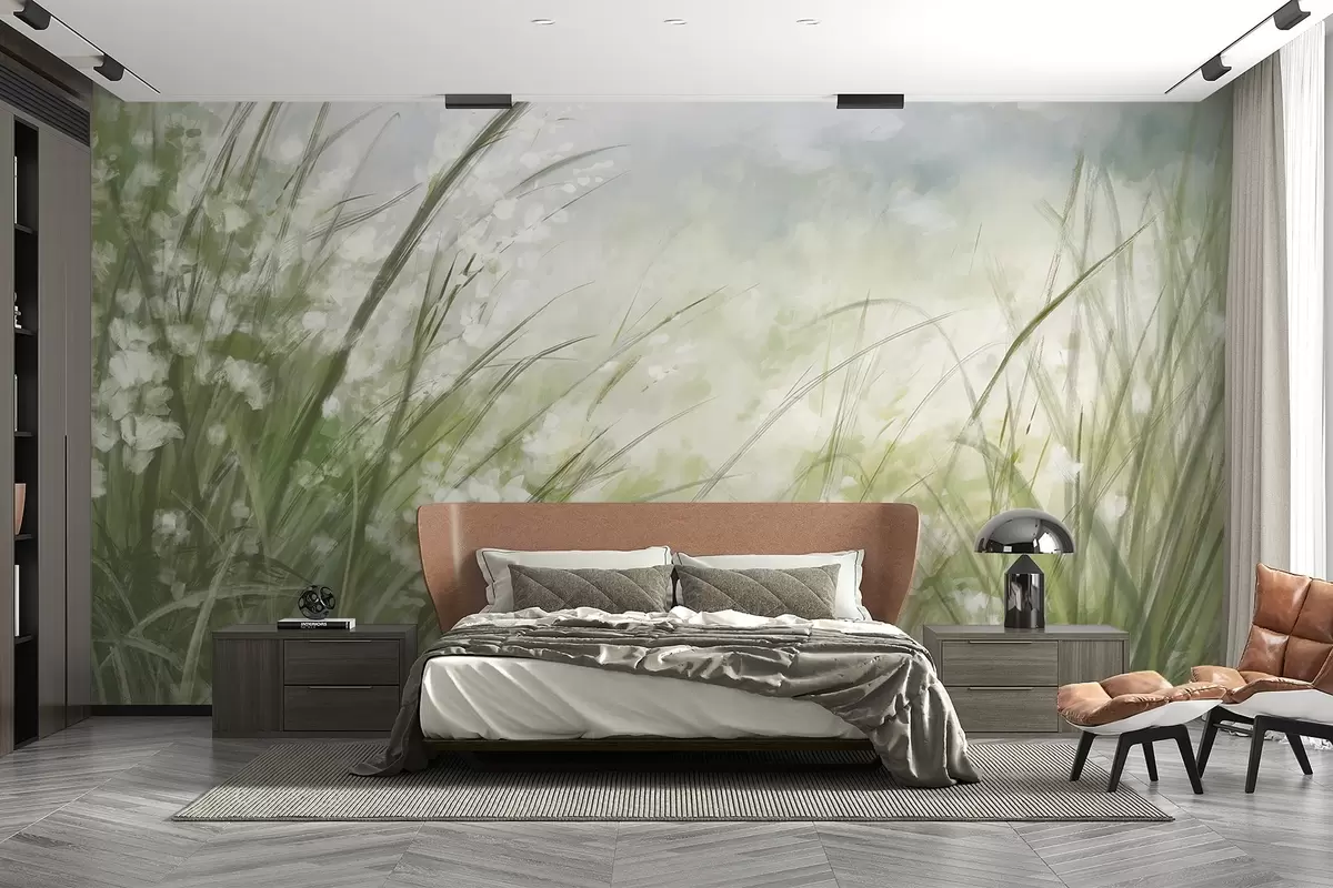 Fotobehang Weelderig groen gras met delicate witte bloemen, zacht vervaagde print met lichte tinten, waardoor een rustig landschap ontstaat N° w08779
