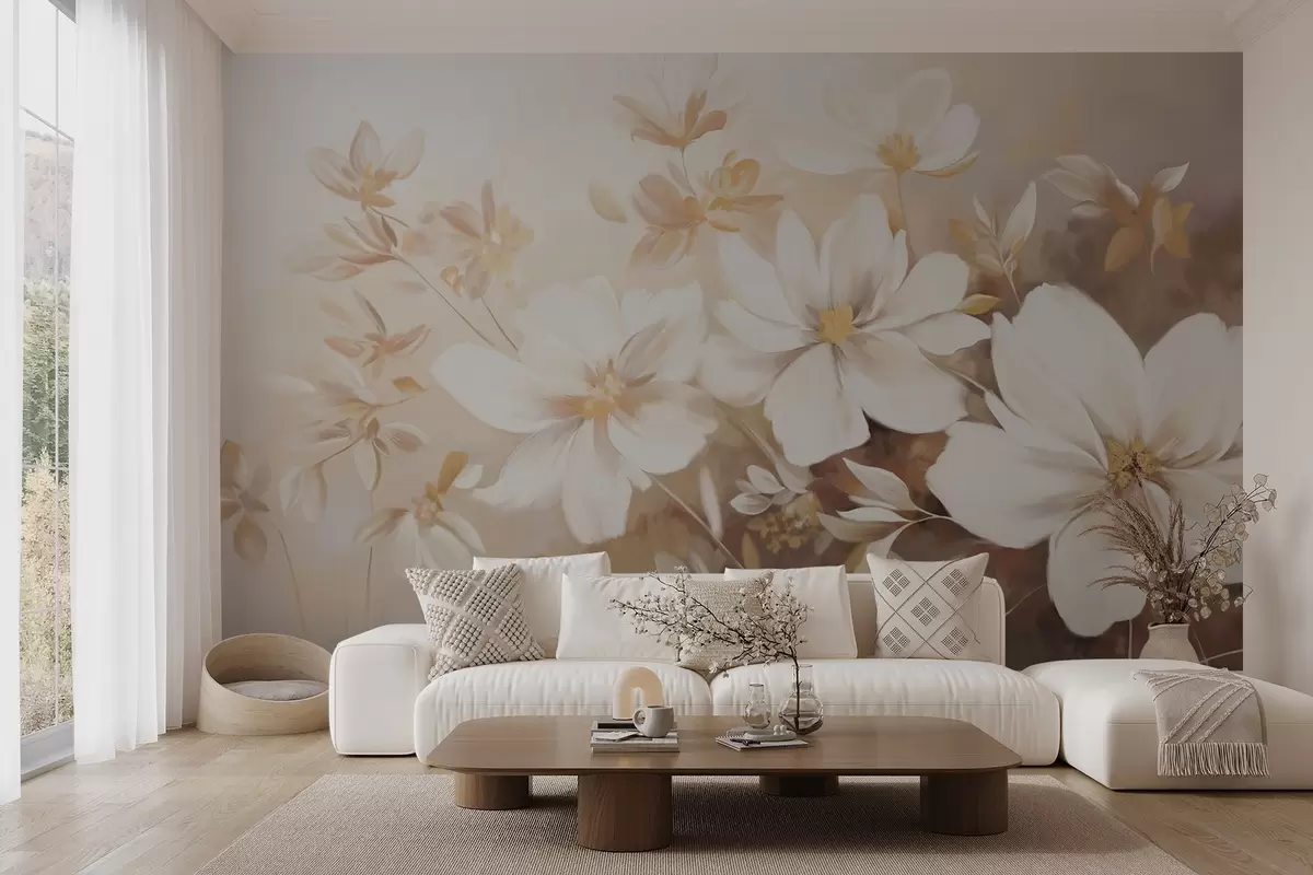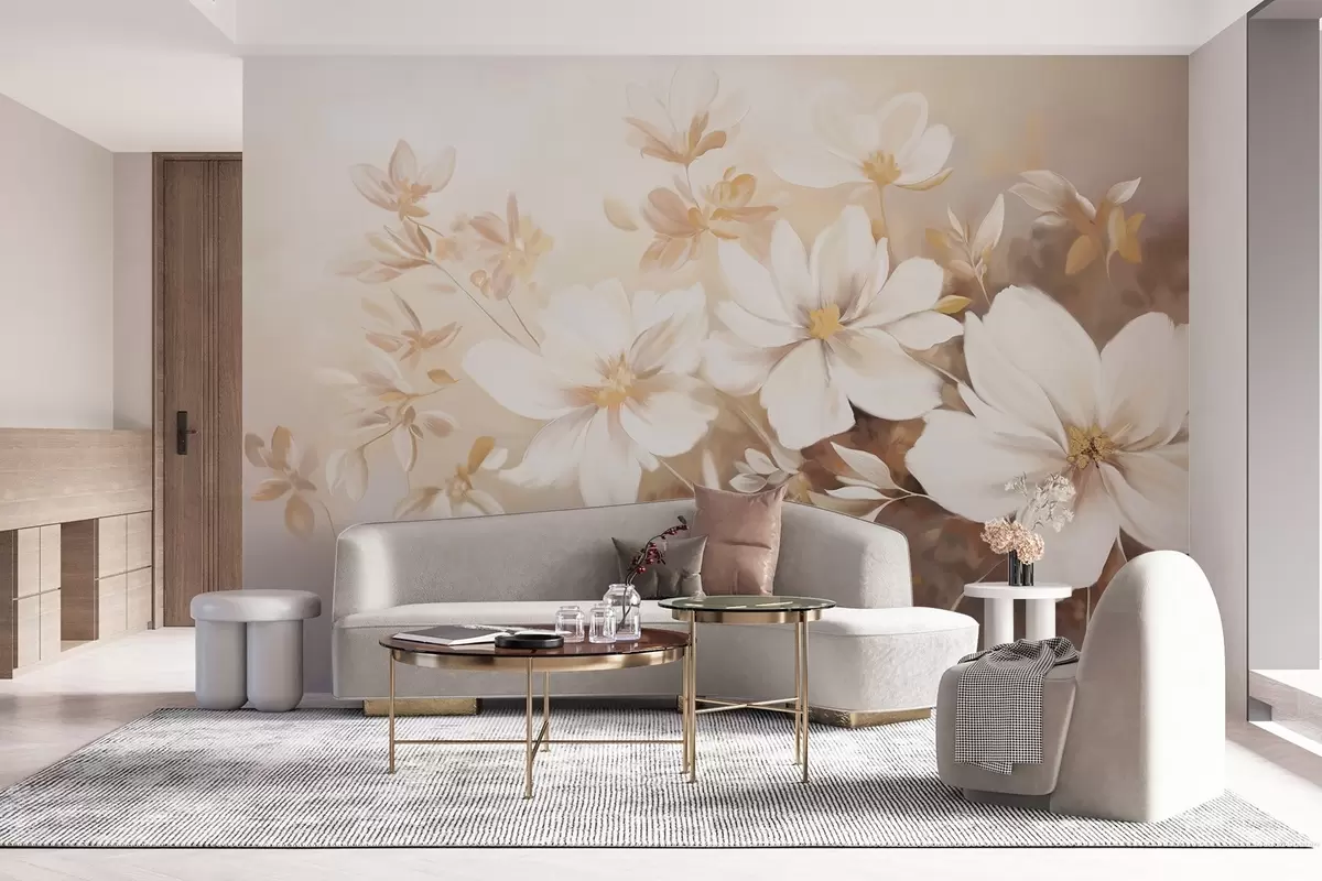 Fotobehang Wit geschilderde bloemen met zachte bloemblaadjes en fijne blaadjes, tegen een lichtbeige en crèmekleurige achtergrond N° w08780