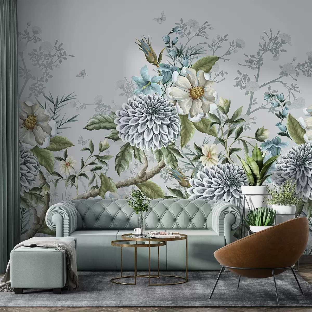 Fotobehang Een bloemenprint met chrysanten, delicate blauwe bloemen en groene bladeren verweven met takken N° w08782