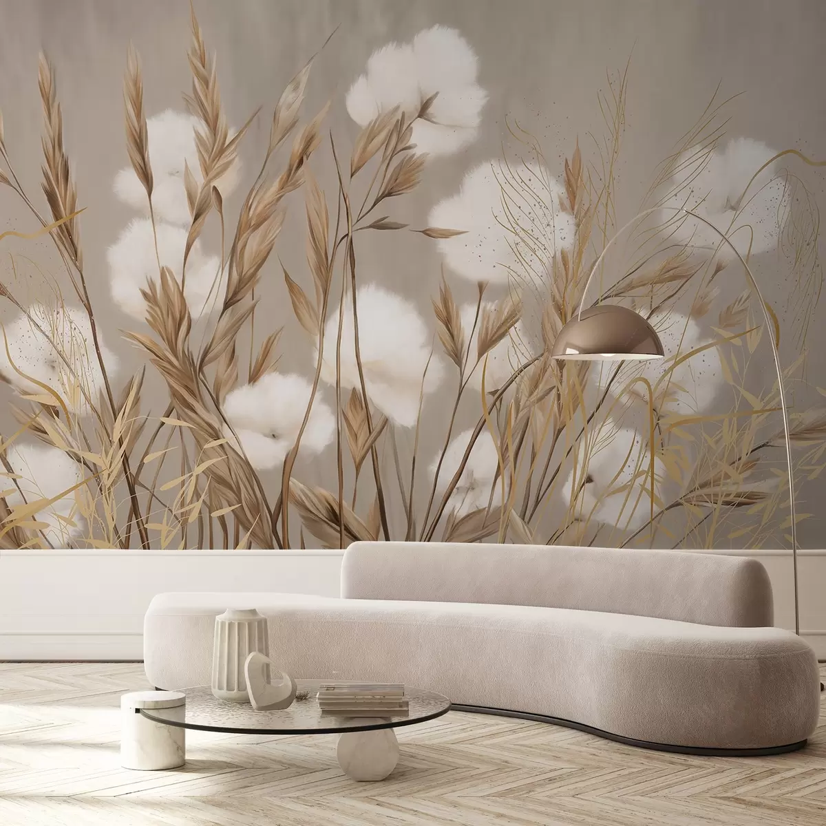 Fotobehang Zachte, pluizige katoenen witte bloemen en hoge oranje aartjes tegen een beige achtergrond met zachte structuur N° w08784