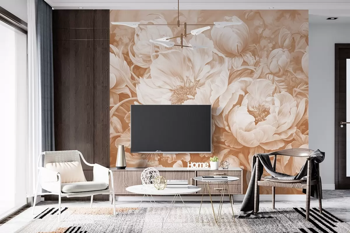 Fotobehang Tulpen en pioenen, een bloemencompositie in een beige olieverfstreekstijl N° w08817v1