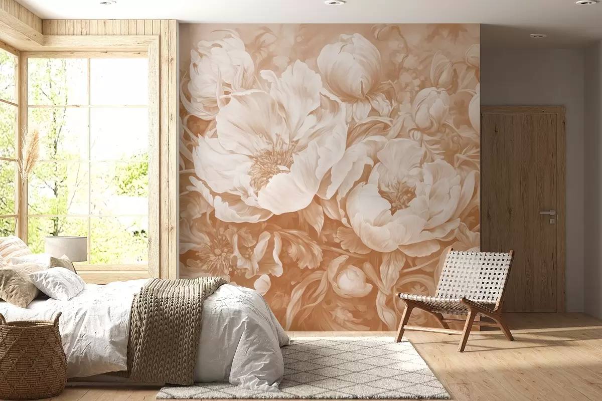 Fotobehang Tulpen en pioenen, een bloemencompositie in een beige olieverfstreekstijl N° w08817v1