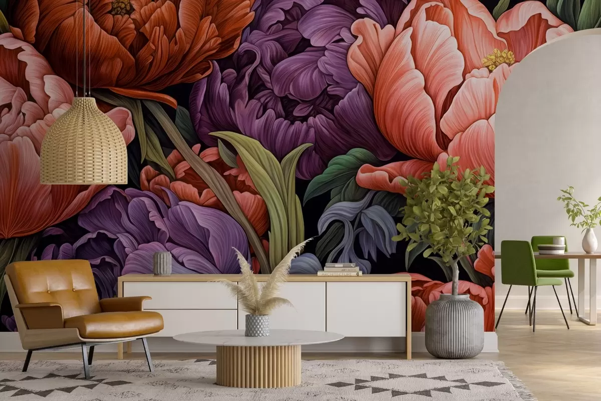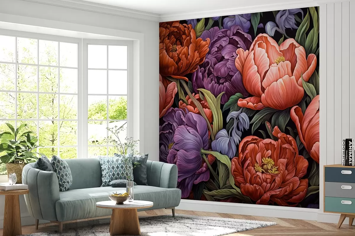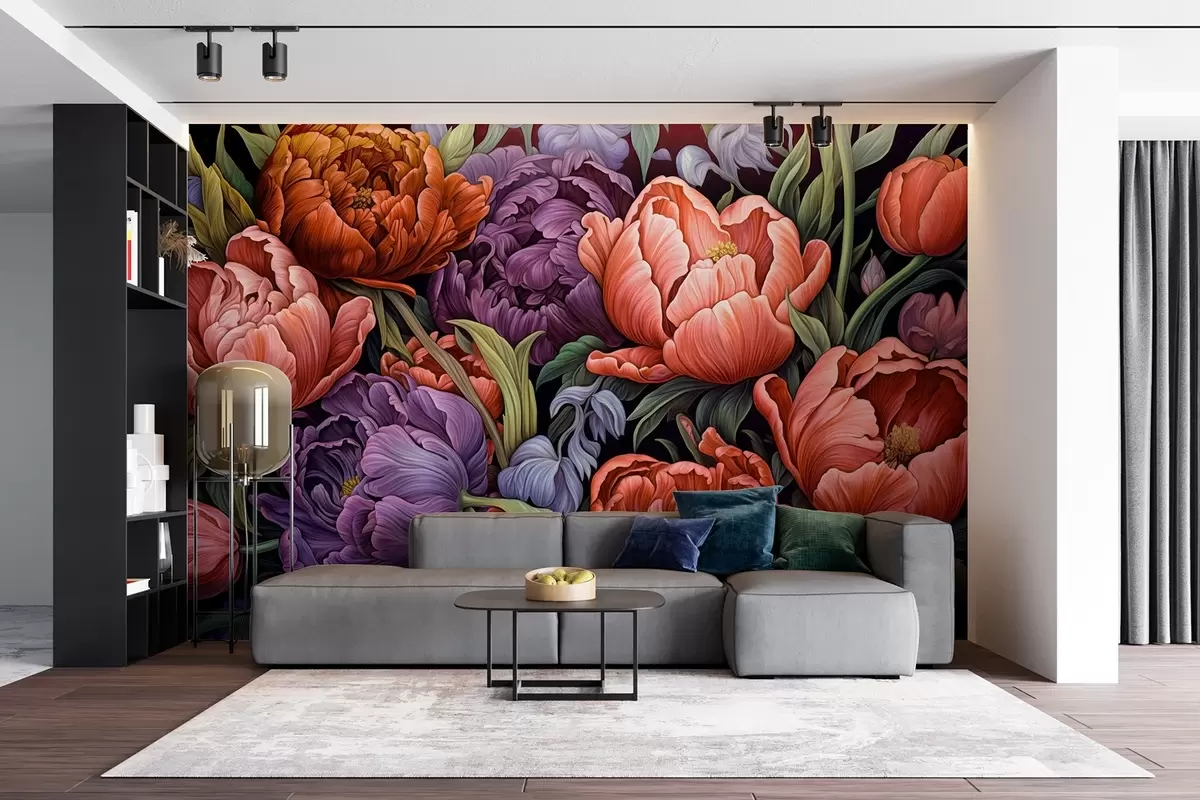 Fotobehang Tulpen en pioenen in Victoriaanse stijl, in rode en paarse kleuren N° w08818v1