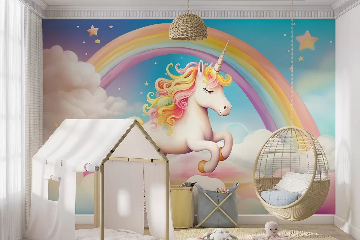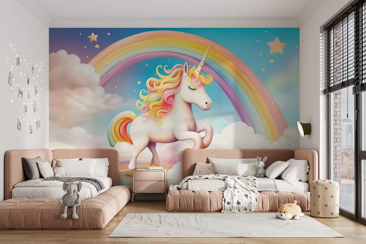 Fotobehang Een eenhoornpaard met een regenboog, wolken en een sterrenhemel N° w08820
