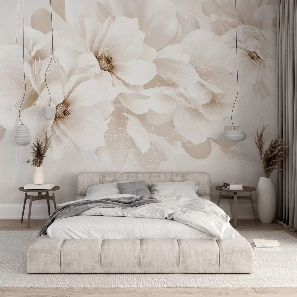 Fotobehang Pastel pioenbloemen met witte en beige bloemblaadjes en witte lijnen op een lichtbeige achtergrond N° w08826v1