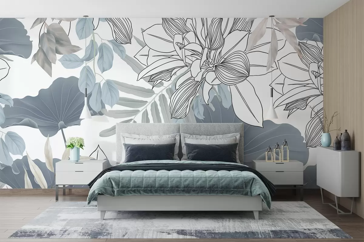 Fotobehang Bloemenprint met lotusbloemen en bladeren in blauw en wit op een witte achtergrond N° w08827
