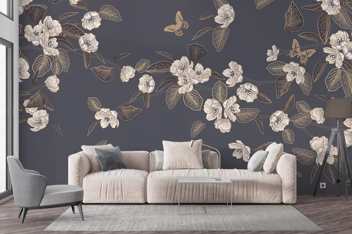 Fotobehang De bloesemtak van de kersenboom met bloemen, bladeren, vlinders op een donkergrijze achtergrond N° w08830