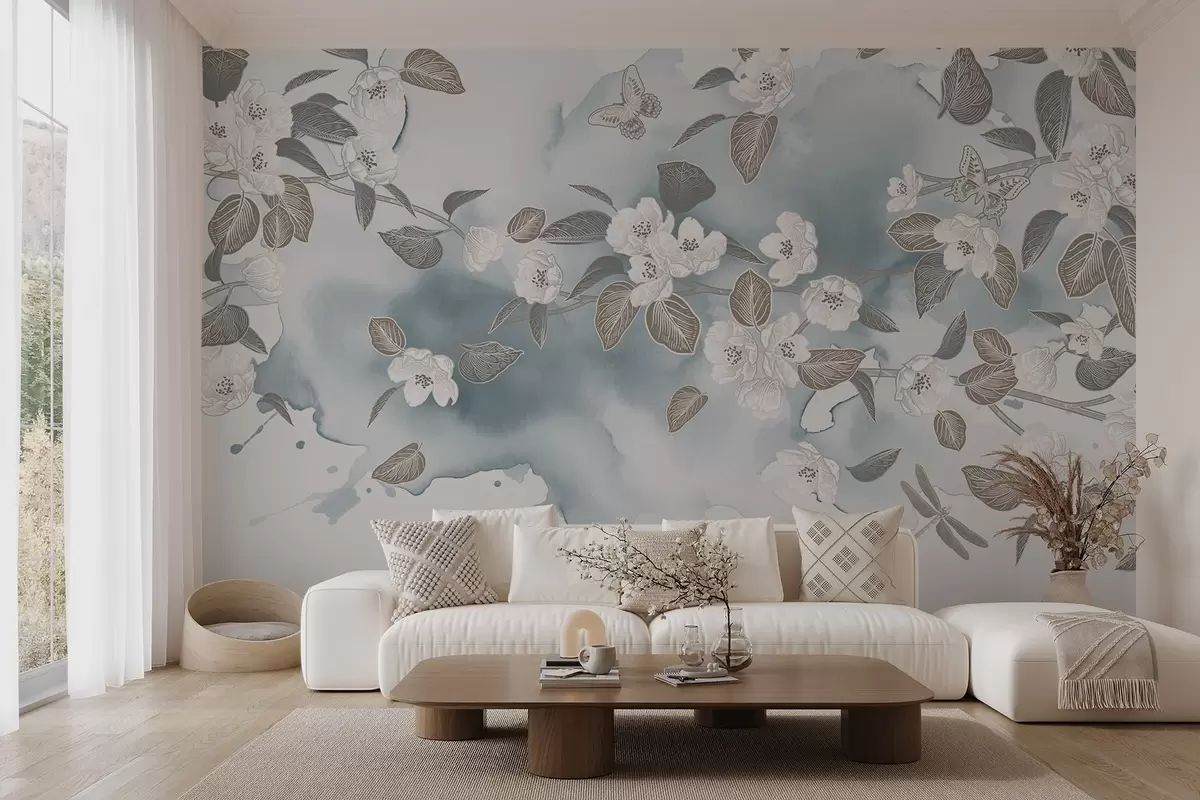 Fotobehang De bloesemtak van de kersenboom met bloemen, bladeren, vlinders op een lichtblauwe aquareltextuurachtergrond N° w08831v1