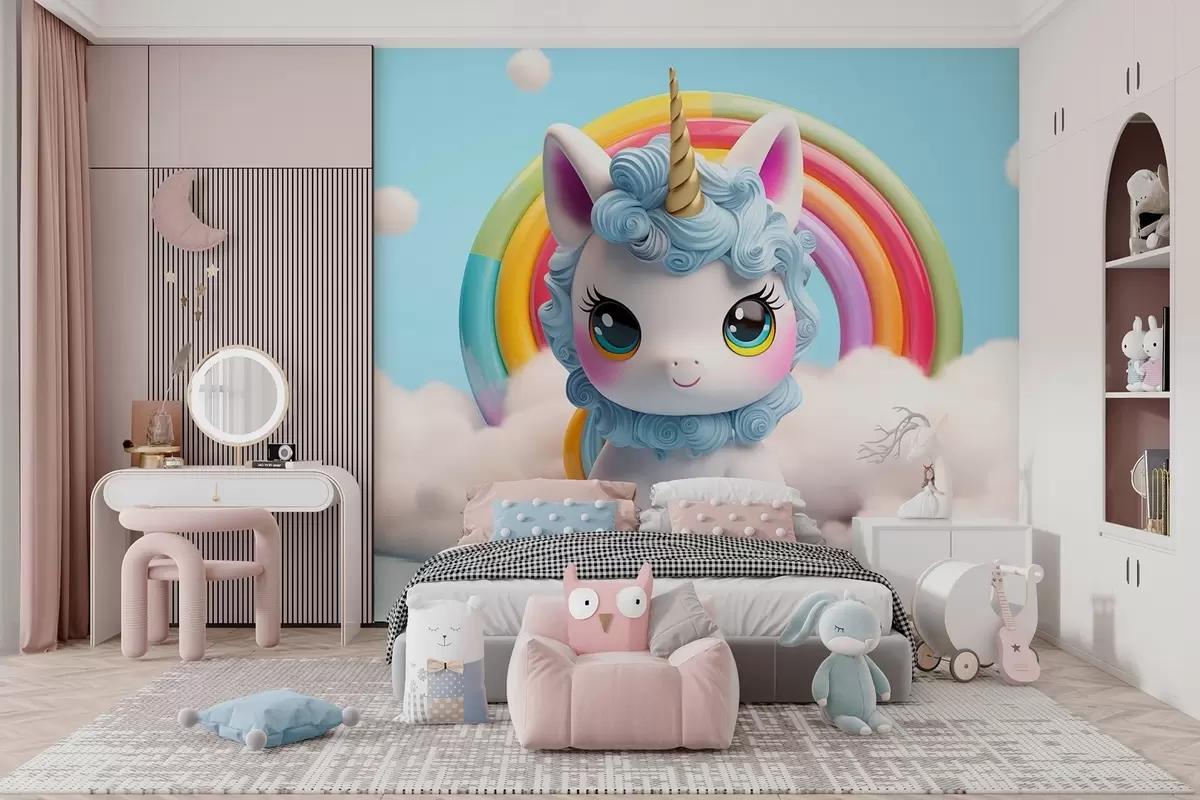 Fotobehang Een 3D schattige eenhoorn omringd door wolken en een regenboog N° w08848