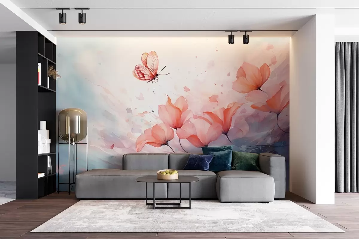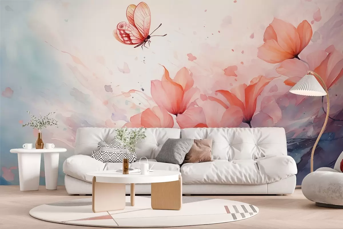 Fotobehang Delicate klaprozen met een vlinder in aquarelstijl N° w08849