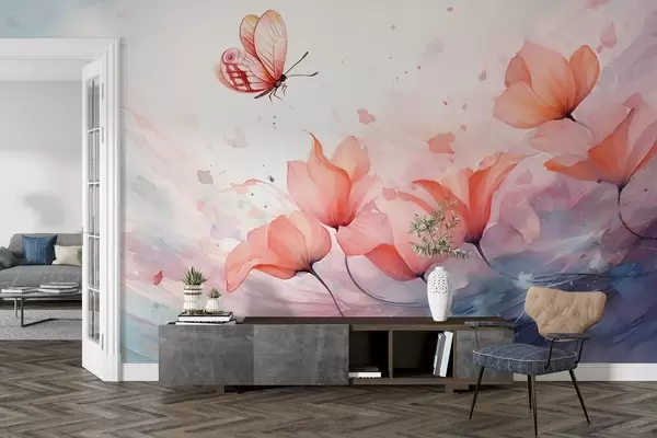 Fotobehang Delicate klaprozen met een vlinder in aquarelstijl N° w08849
