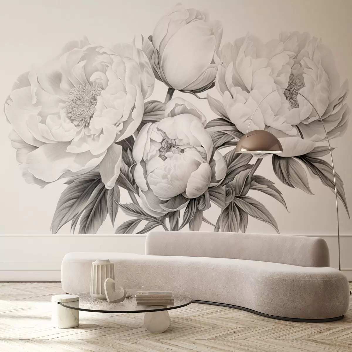 Fotobehang Zwart-witte pioenrozen in potloodtekeningstijl N° w08852