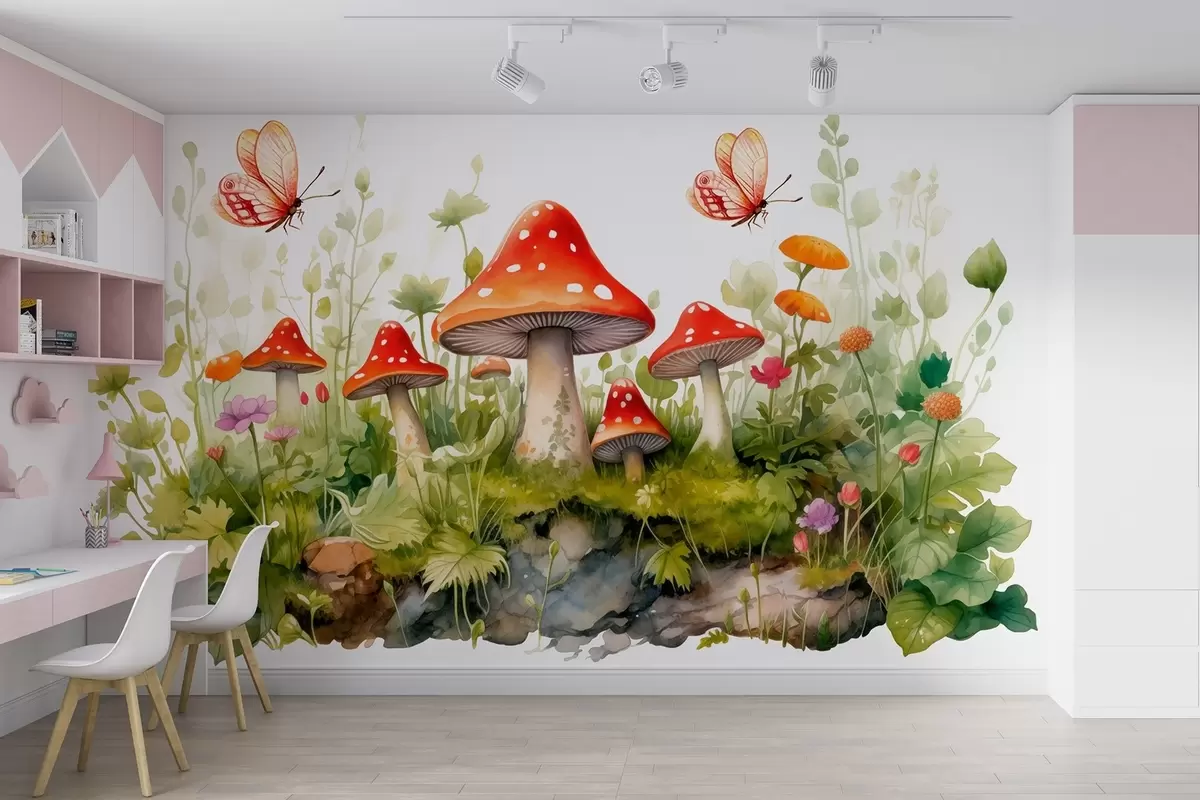 Fotobehang Een boslandschap op een witte achtergrond in aquarelstijl met paddenstoelen, kikkers en vlinders N° w08854