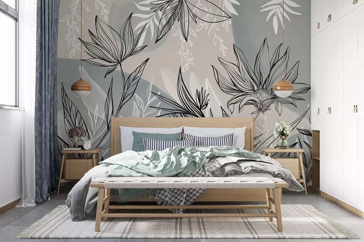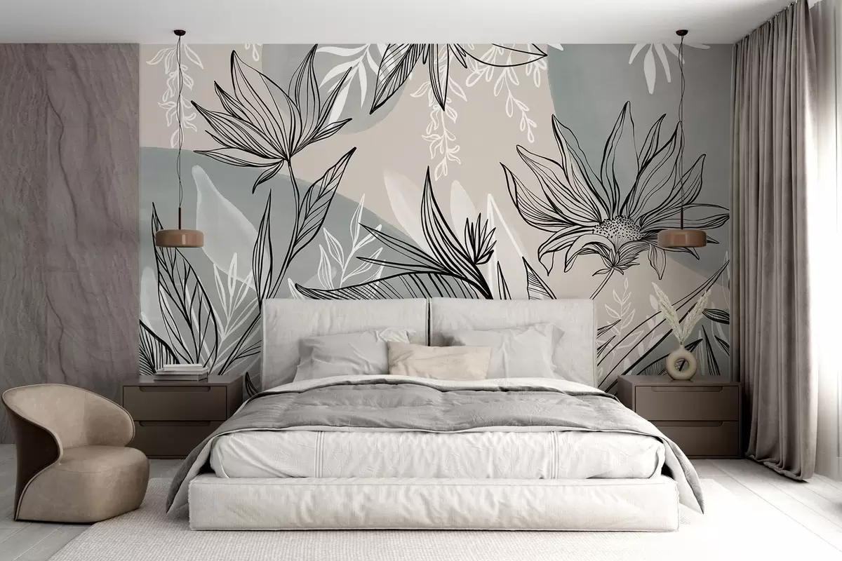 Fotobehang Florale lijntekeningen met grote bladeren en bloemen tegen een achtergrond van beige en blauwe aquarelwassingen N° w08865