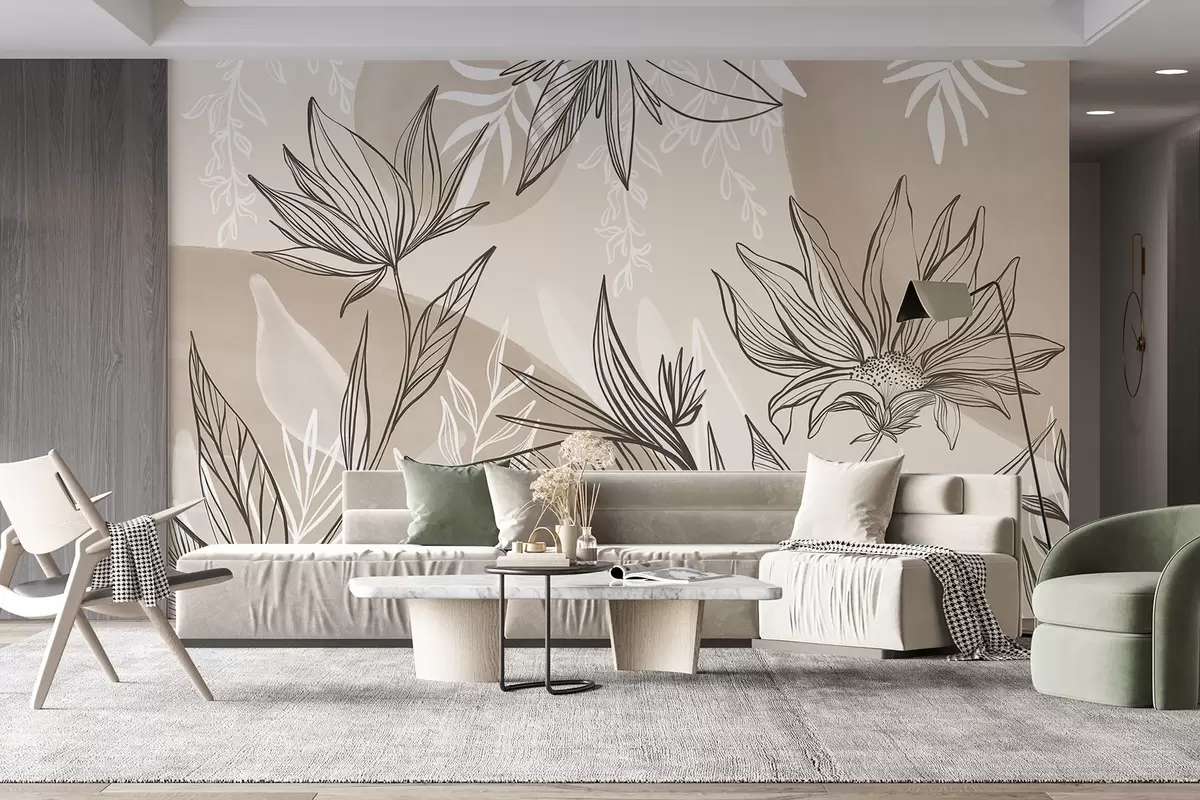 Fotobehang Florale lijntekeningen met grote bladeren en bloemen tegen een achtergrond van beige aquarelwassingen N° w08865v1