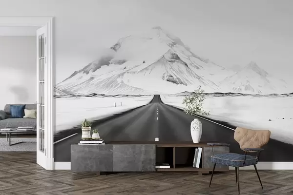 Fotobehang Een zwart-wit landschap met een weg die leidt naar de bergen met een lichte mist N° w08876
