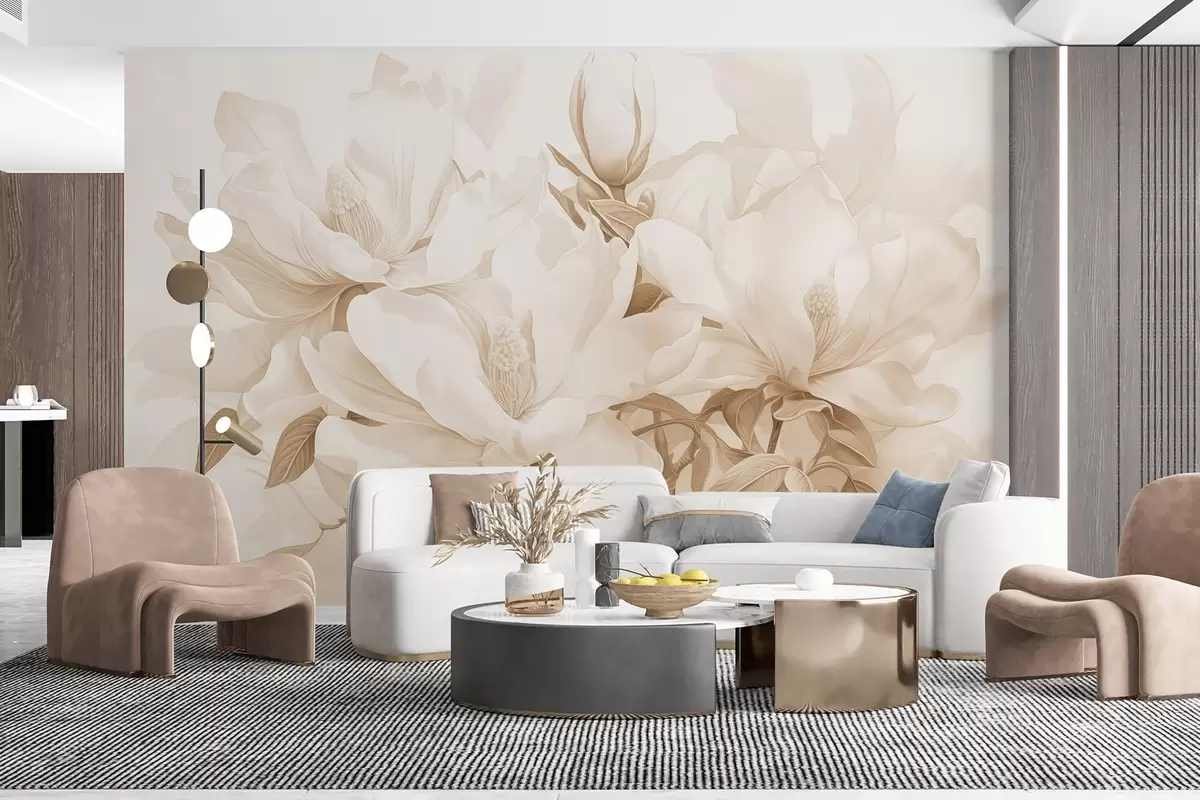 Fotobehang Magnolia bloemen met witte en beige bloemblaadjes, bladeren en bruine takken, zachte en delicate aquarelstijl N° w08886