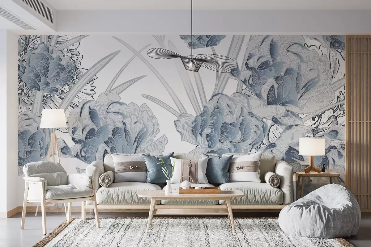 Fotobehang Blauwe pioenrozen met bladeren op een witte achtergrond, bloemenontwerp, botanische illustratie N° w08896