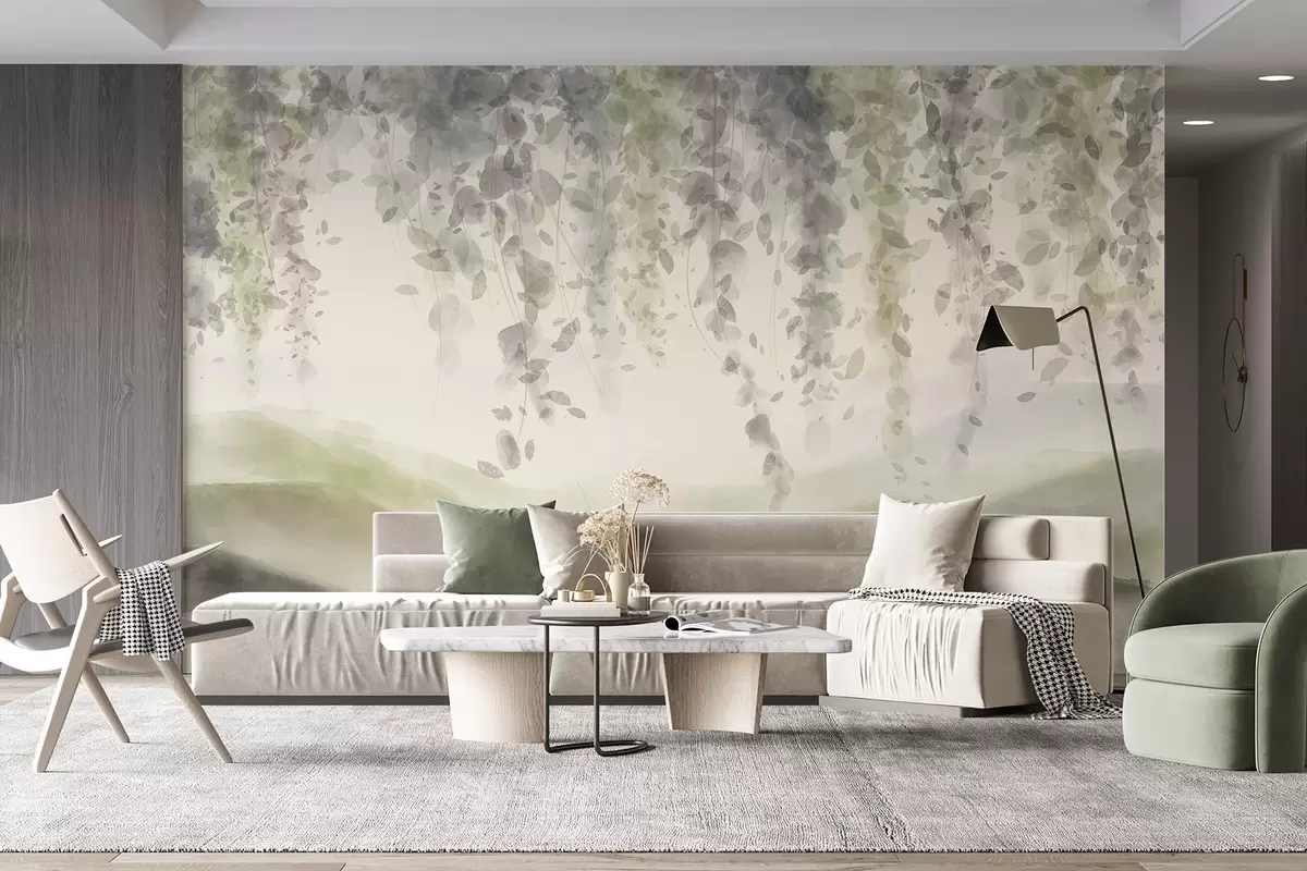 Fotobehang Wisteria bladeren hangend over bergen, zachte pastel groene en beige kleuren, aquarel stijl landschap N° w08909v2