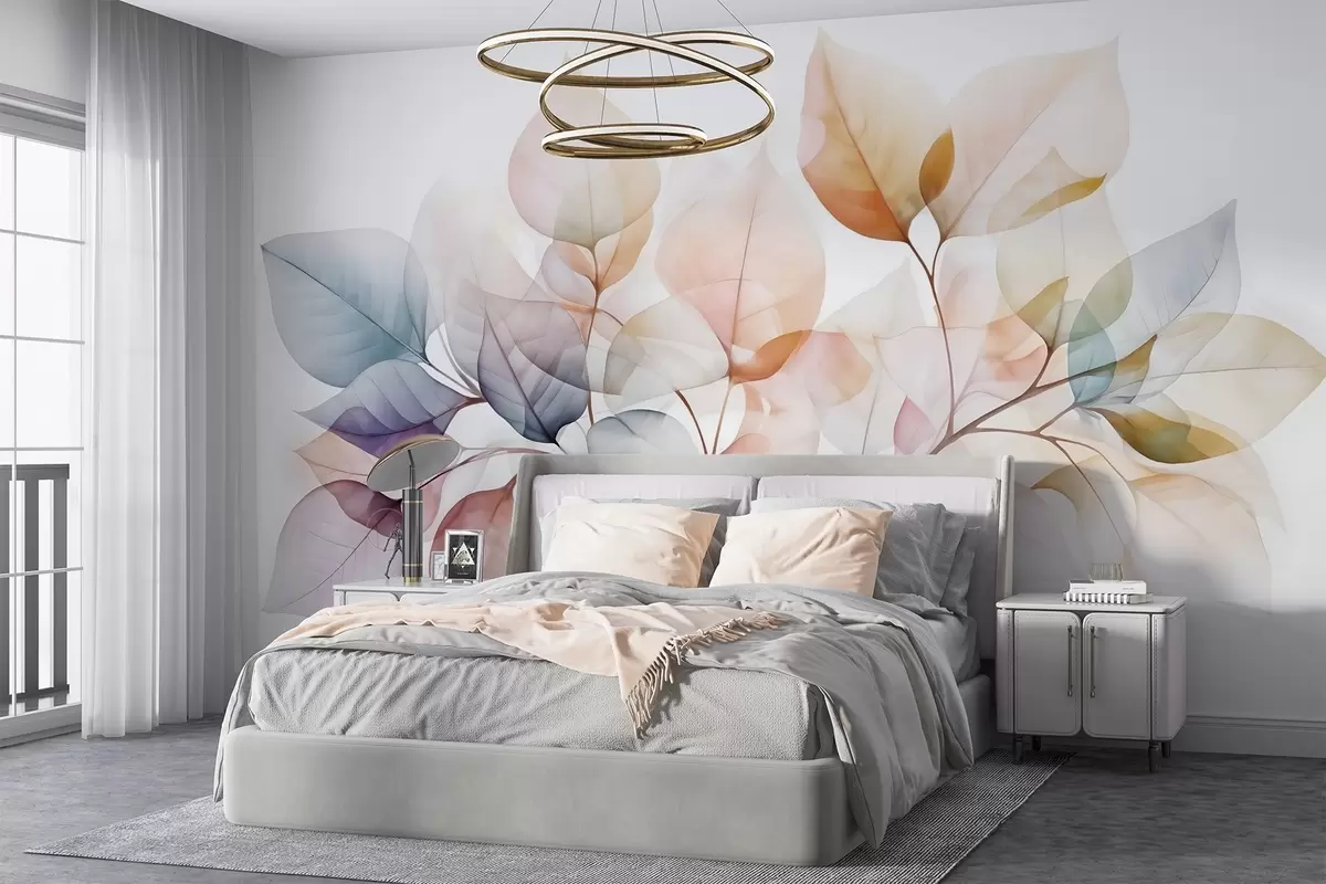 Fotobehang Aquarelverfschilderij van doorschijnende bladeren in pastelkleuren, met tinten roze, wit, paars en blauw N° w08910