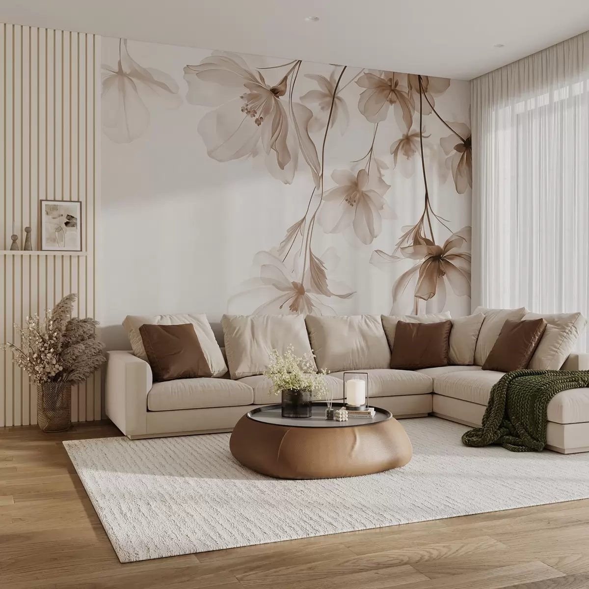 Fotobehang Beige bloemen met doorschijnende bloemblaadjes hangend aan een tak, beige en wit, minimalistische moderne kunst compositie N° w08911v1