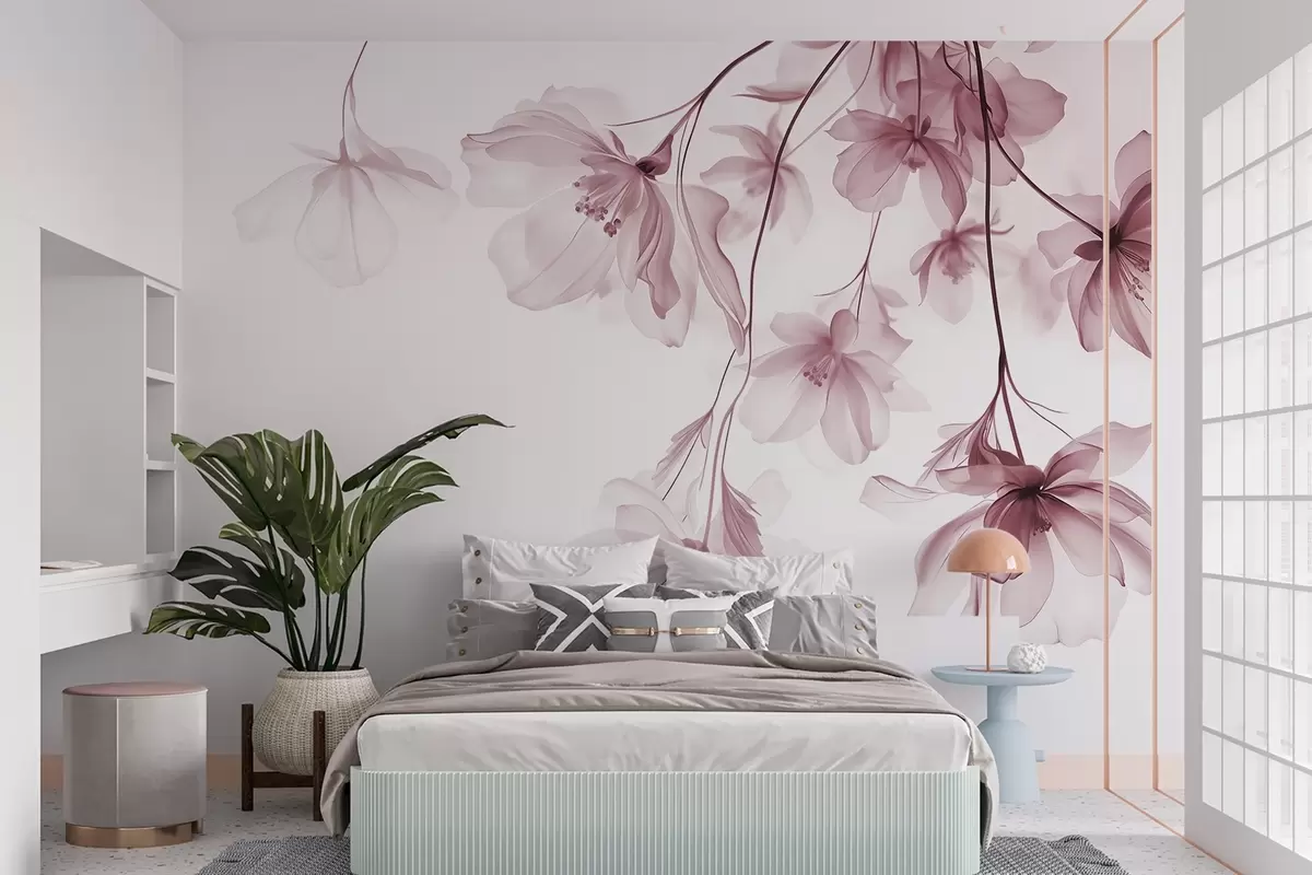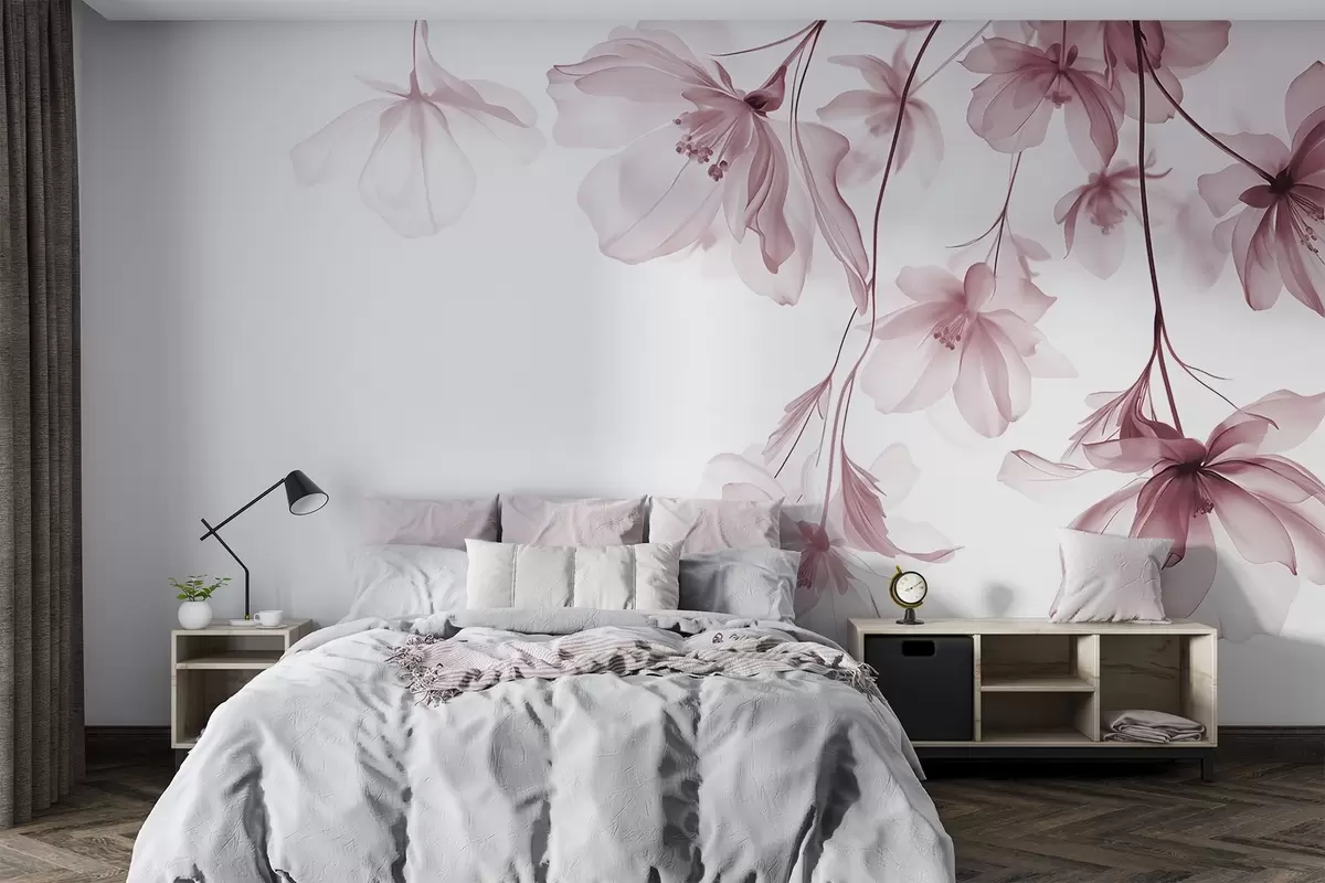 Fotobehang Roze bloemen met doorschijnende bloemblaadjes hangend aan een tak, roze en wit, minimalistische moderne kunst compositie N° w08911v2