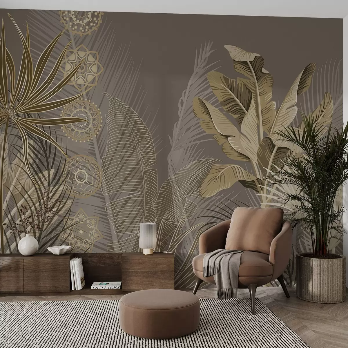 Fotobehang Tropische bladeren in beige en bruine tinten, palmbladeren, bananenbladeren en mandala ornamenten, donkere achtergrond N° w08913v1