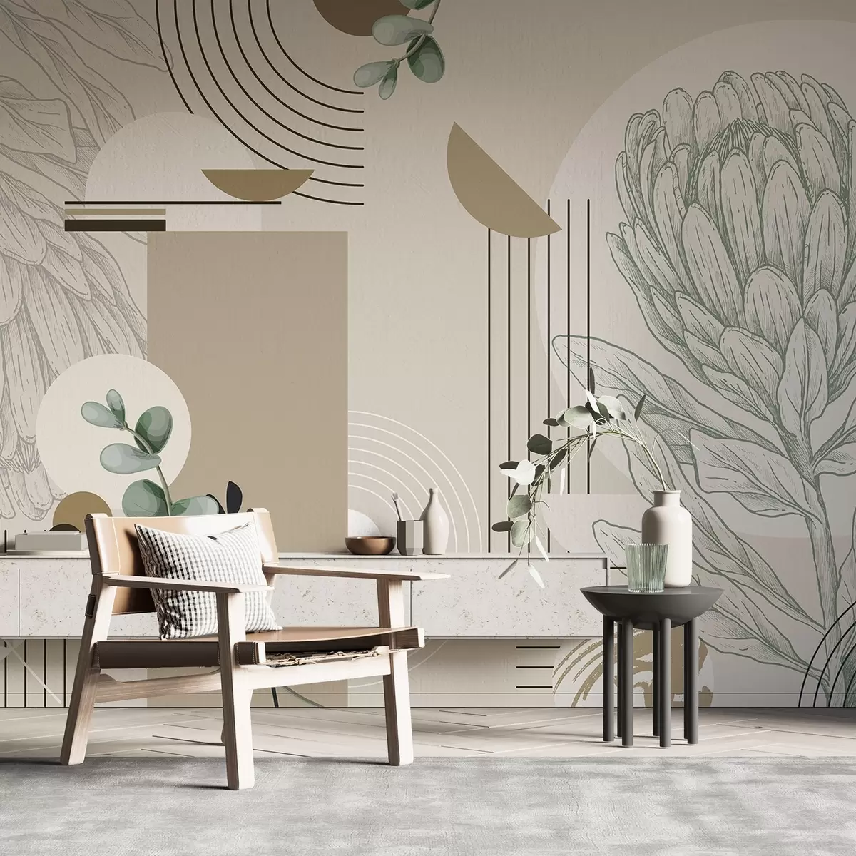 Fotobehang Abstracte botanische print met proteabloem, eucalyptusbladeren, geometrische vormen in een minimalistische stijl, pastelkleuren N° w08914