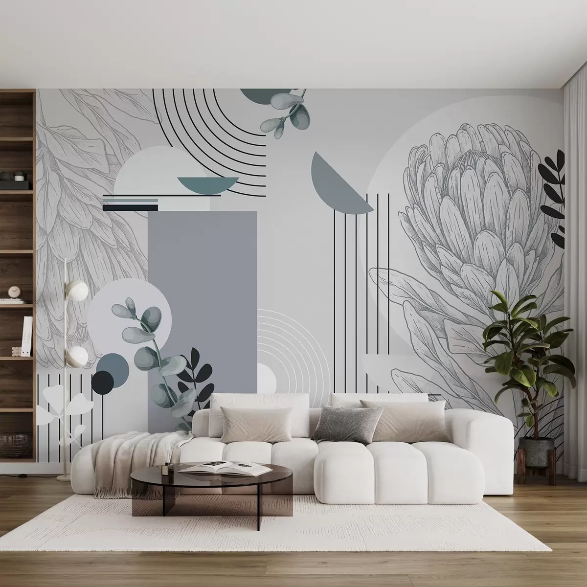 Fotobehang Abstracte botanische print met proteabloem, eucalyptusbladeren, geometrische vormen in een minimalistische stijl, pastelkleuren N° w08914v1