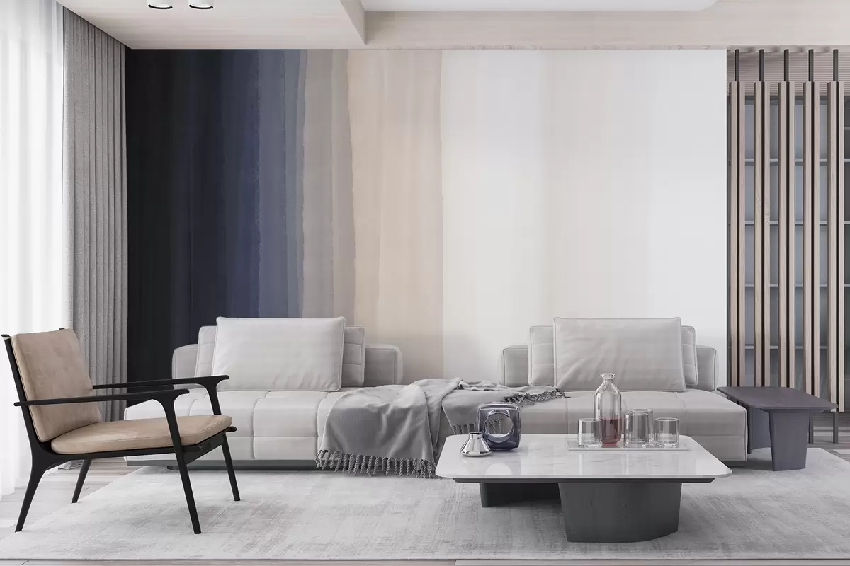 Fotobehang Abstracte minimalistische gradiëntprint met verticale strepen van donkerblauw, licht perzik en wit N° w08915v1