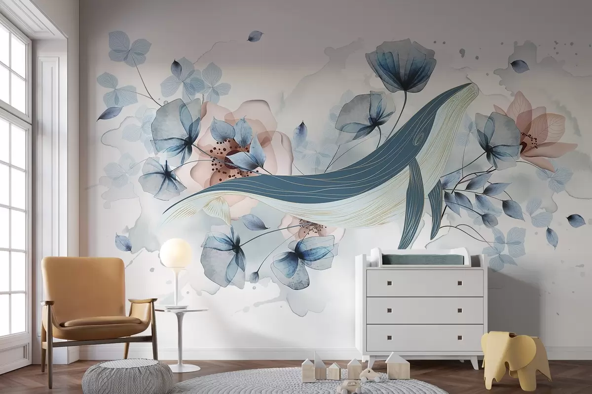 Fotobehang Een blauwe walvis met bloemen, aquarel stijl, lichtblauwe en roze kleuren, lichte achtergrond N° w08922