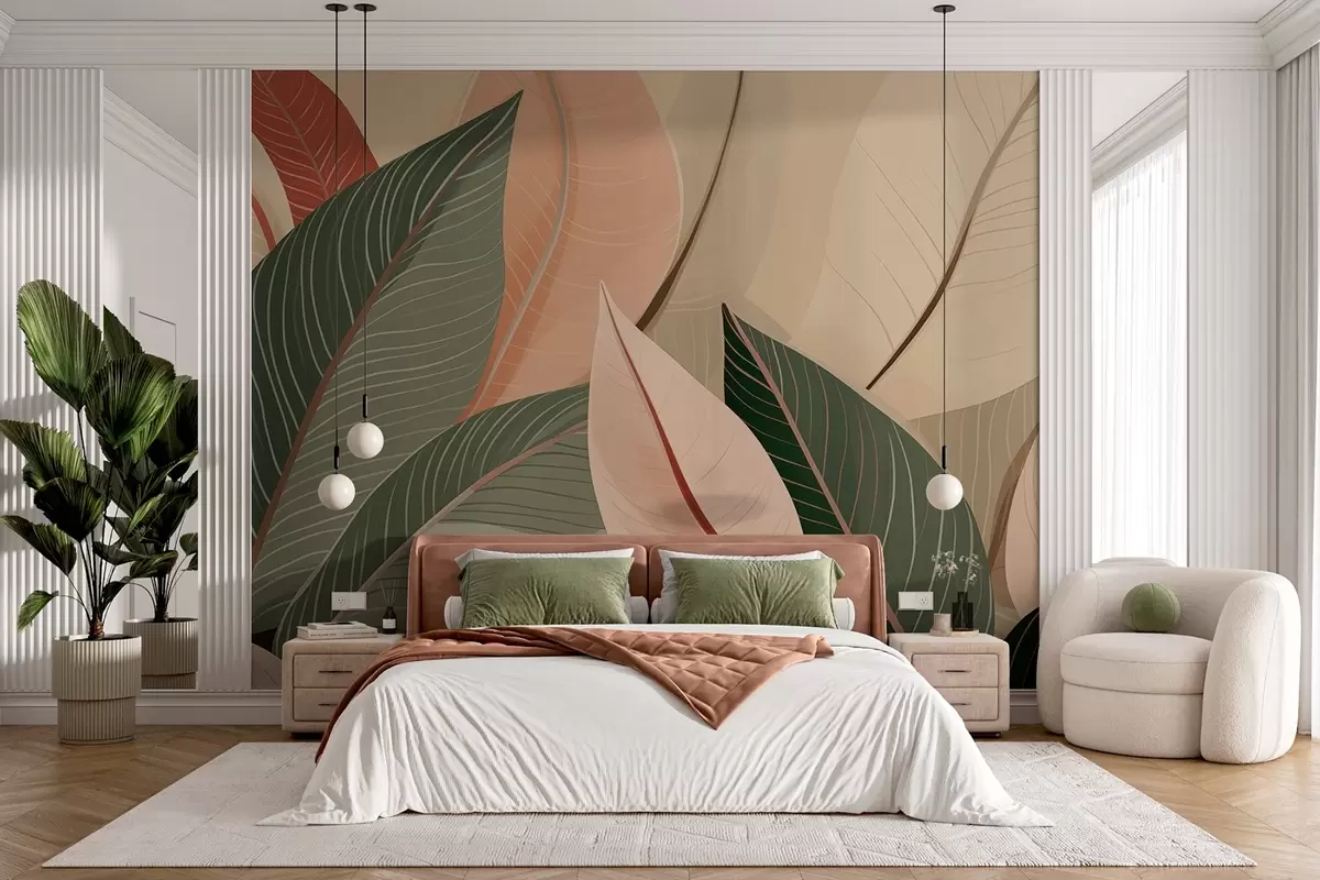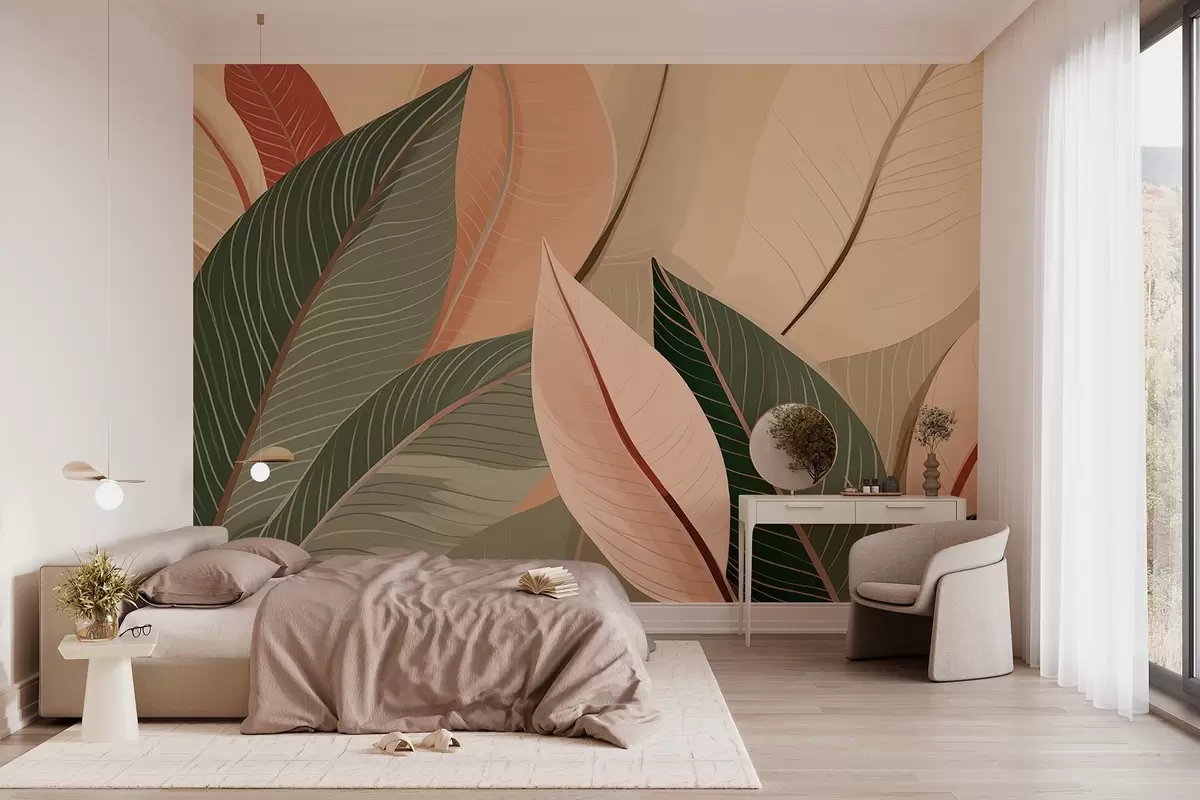 Fotobehang Close-up van bladeren in olijfgroene en roze-crème kleuren N° w08944